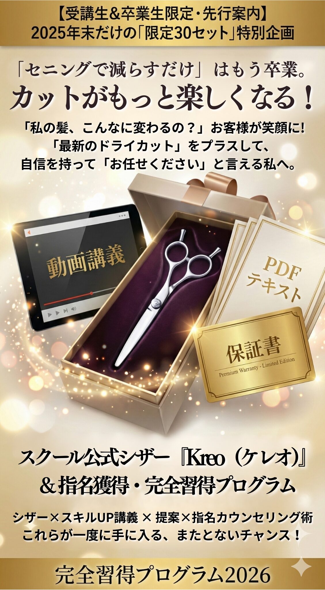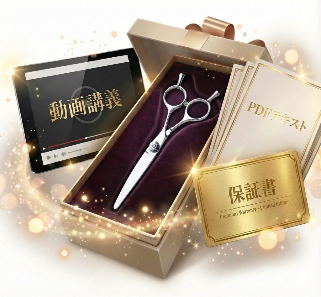 25万円クラスの最高峰シザーに、本来なら高額な講義プログラムまでついて、この価格でご提供します。